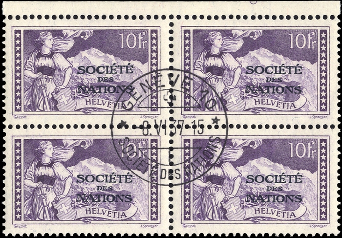 1922, 15 Werte Freimarken Schweiz mit SDN-Aufdruck als kompletter Satz fast zentrisch gestempelt im 4-er Block Satz (ME 1.400.-)