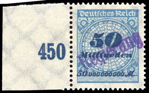 1923, 50 Mrd. Inflationsmarke postfrisch mit Dienst- Kontrollaufdruck von Frankfurt, aktuelle Farbfotobefund- Kopie Weinbuch BPP vom 25.04.2017 von einem ehemaligen 4-er Block "... echt und einwandfrei.... "