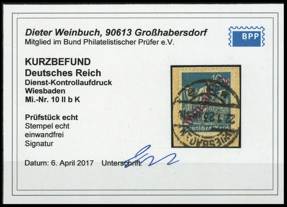 1923, 10 Mark Freimarke "Schnitter" mit kopfstehendem rotem Dienst- Kontrollaufdruck Type "II" von Wiesbaden auf sauber gestempelten Briefstückchen, aktueller Farb- Kurzbefund Weinbuch BPP vom 06.04.2017 "echt und einwandfrei". Die Auflage betrug nur wenige Stücke!