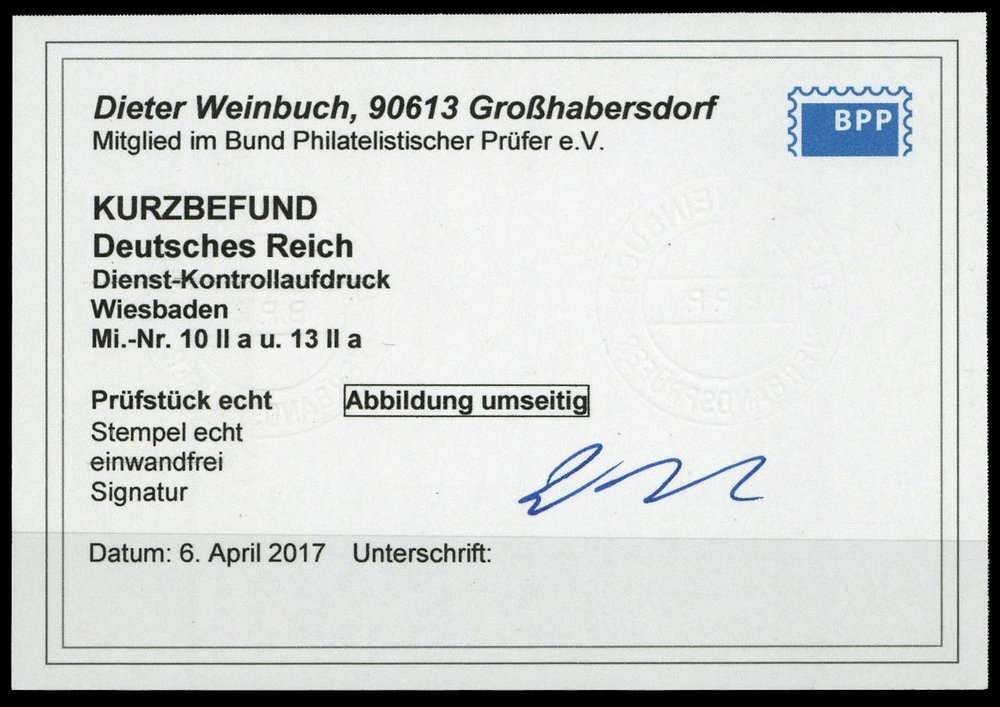 1923, 20 Mark Freimarke "Posthorn" und 10 Mark Arbeiter "Schnitter" mit violettschwarzem Dienst- Kontrollaufdruck Type "II" von Wiesbaden auf Briefstückchen, aktueller Farb- Kurzbefund Weinbuch BPP vom 06.04.2017 "echt und einwandfrei". Die Auflage für die 20 Mark Posthorn betrug nur 50 Stück !