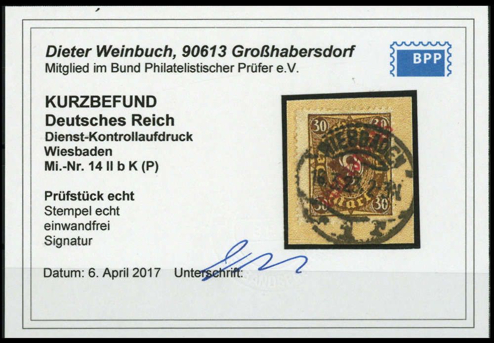 1923, 30 Mark Freimarke "Posthorn" (P) mit kopfstehendem rotem Dienst- Kontrollaufdruck Type "II" von Wiesbaden auf sauber gestempelten Briefstückchen, aktueller Farb- Kurzbefund Weinbuch BPP vom 06.04.2017 "echt und einwandfrei". Die Auflage betrug nur wenige Stücke!