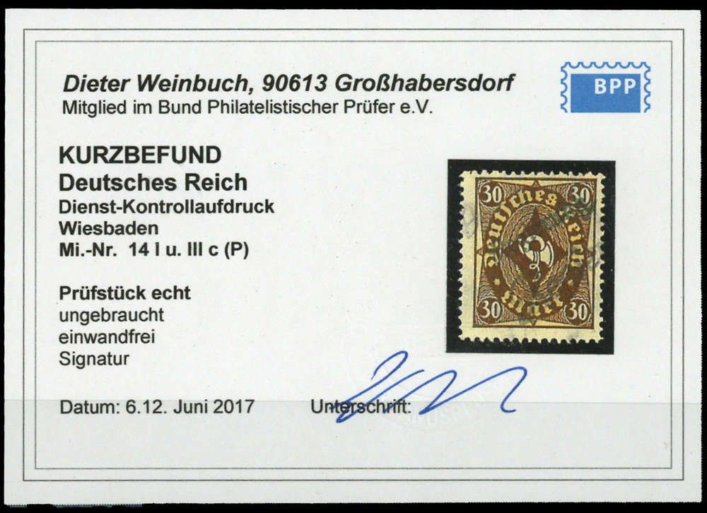 1923, 30 Mark Freimarke "Posthorn" (P) mit grünem Dienst- Kontrollaufdruck in der Type "I" und "III" von Wiesbaden auf der gleichen Marke, aktueller Farb- Kurzbefund Weinbuch BPP vom 12.06.2017 "echt und einwandfrei". Die Auflage betrug nur einige Stücke!