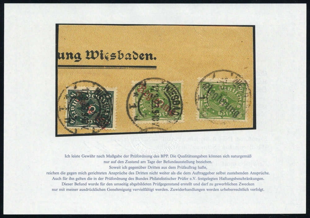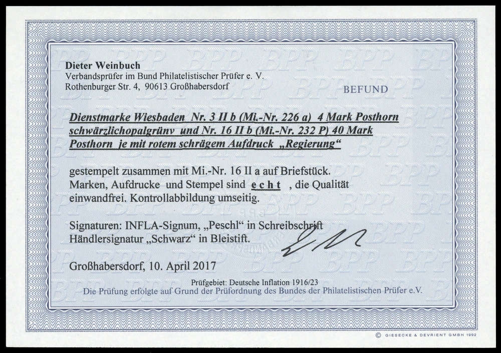 1923, 40 Mark Freimarke "Posthorn" mit rotem Dienst- Kontrollaufdruck Type "II" von Wiesbaden auf sauber gestempelten Briefstückchen, es existierte ein aktueller Farbfotobefund Weinbuch BPP vom 10.04.2017 "echt und einwandfrei" der für eine größere Einheit ausgestellt wurde. Geprüft Infla Berlin und Peschl, die Auflage betrug nur wenige Stücke!