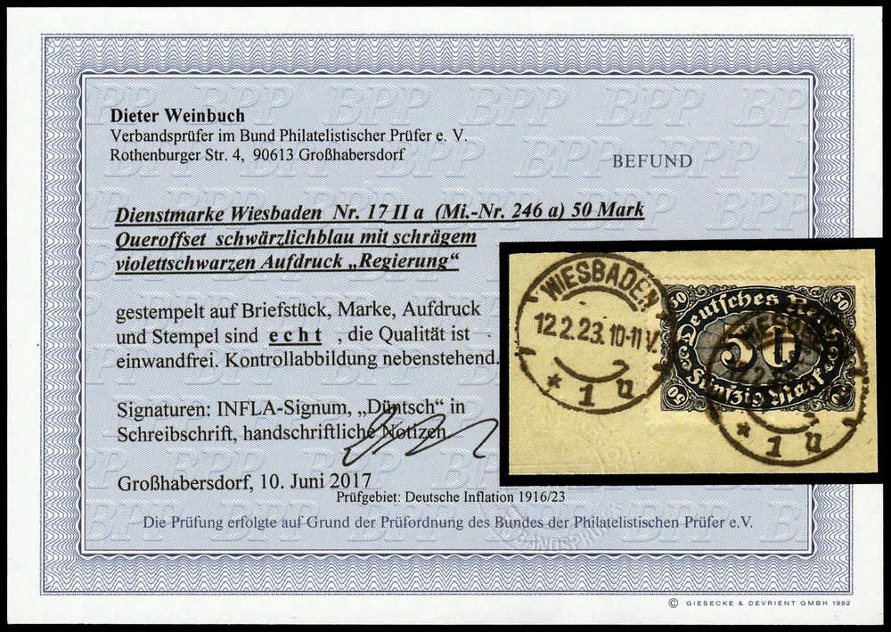 1923, 50 Mark Freimarke "Ziffer" mit violettschwarzem Dienst- Kontrollaufdruck Type "II" von Wiesbaden auf sauber gestempelten Briefstückchen, aktueller Farbfotobefund Weinbuch BPP vom 10.06.2017 "echt und einwandfrei". Die Auflage betrug nur einige Stücke! Im Michel- Spezial 2018 ohne Preisnotierung!