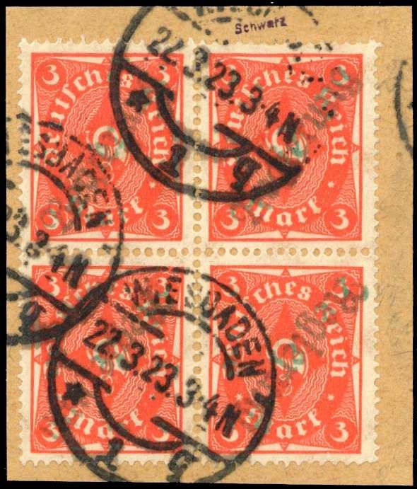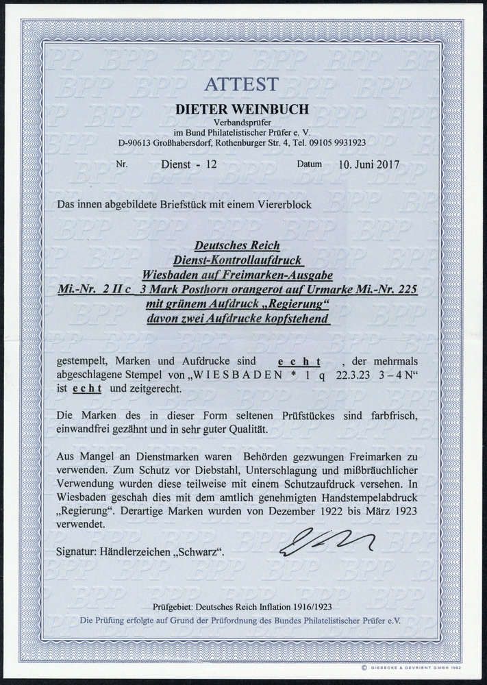 1923, 3 Mark Freimarke "Posthorn" im 4-er Block, dabei das untere Paar mit kopfstehendem grünem Dienst- Kontrollaufdruck Type "II" von Wiesbaden auf sauber gestempelten Briefstückchen, aktuelles Farbfotoattest Weinbuch BPP vom 10.06.2017 "echt und einwandfrei.... Die Marken des in dieser Form seltenen Prüfstückes sind farbfrisch, einwandfrei gezähnt und in sehr guter Qualität ...". Die Auflage betrug nur wenige Stücke!