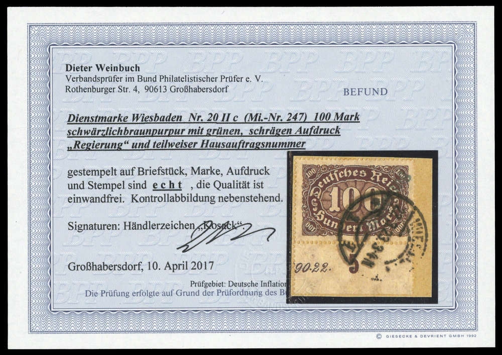 1923, 100 Mark Freimarke "Ziffer" mit grünem Dienst- Kontrollaufdruck Type "II" von Wiesbaden auf sauber gestempelten Briefstückchen und Teilen der HAN, aktueller Farbfotobefund Weinbuch BPP vom 10.04.2017 "echt und einwandfrei". Die Auflage betrug nur einige Stücke! Im Michel- Spezial 2018 ohne Preisnotierung!