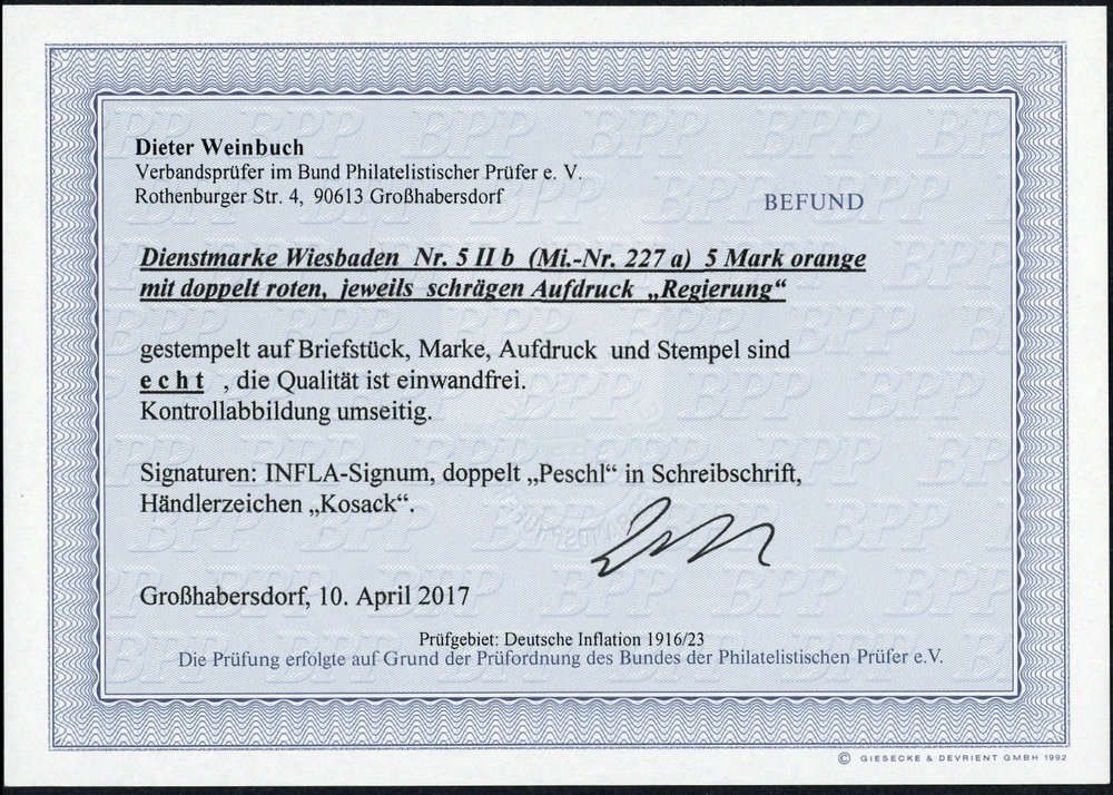 1923, 5 Mark Freimarke "Posthorn" mit doppeltem rotem Dienst- Kontrollaufdruck Type "II" von Wiesbaden auf sauber gestempelten Briefstückchen, aktueller Farbfotobefund Weinbuch BPP vom 10.04.2017 "echt und einwandfrei". Die Auflage betrug nur einige Stücke!