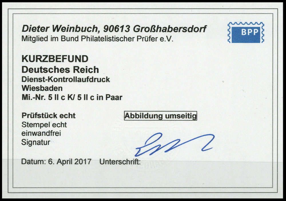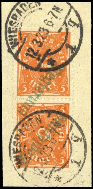 1923, 5 Mark Freimarke "Posthorn" im senkrechten Paar, dabei einmal mit kopfstehendem und einmal mit normalem und gleichzeitig kopfstehendem grünem Dienst- Kontrollaufdruck Type "II" von Wiesbaden auf sauber gestempelten Briefstückchen, aktueller Farb- Kurzbefund Weinbuch BPP vom 06.04.2017 "echt und einwandfrei". Die Auflage betrug nur wenige Stücke!