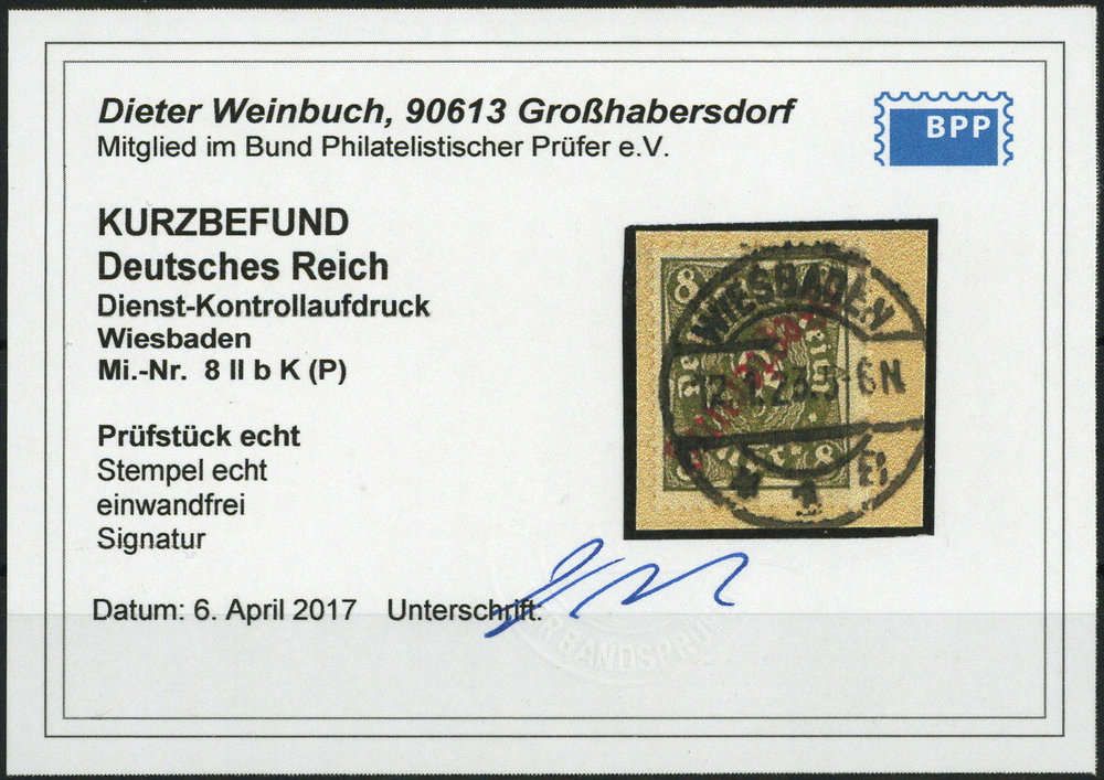 1923, 8 Mark Freimarke "Posthorn" mit kopfstehendem rotem Dienst- Kontrollaufdruck Type "II" von Wiesbaden auf sauber gestempelten Briefstückchen, aktueller Farb- Kurzbefund Weinbuch BPP vom 06.04.2017 "echt und einwandfrei". Die Auflage betrug nur wenige Stücke!