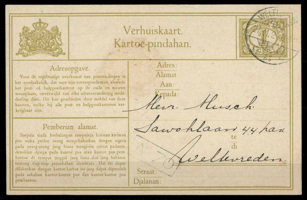 1924, 1 C gelboliv, Umzugsmeldekarte, DB "WELTEVREDEN 27.11.29", Beförderungs- Altersspuren