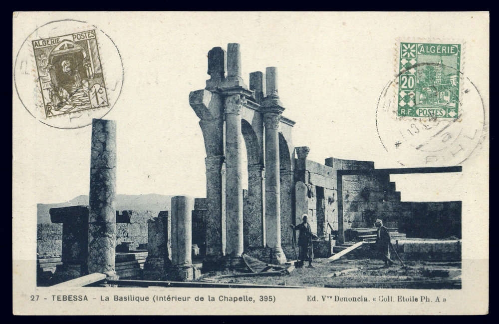 1926, 20 C grün und 1 C olivbraun, vs. auf blauer AK (Tebessa, Basilika und Kapelle, 395), Palikao "13.X.26", ohne Anschrift
