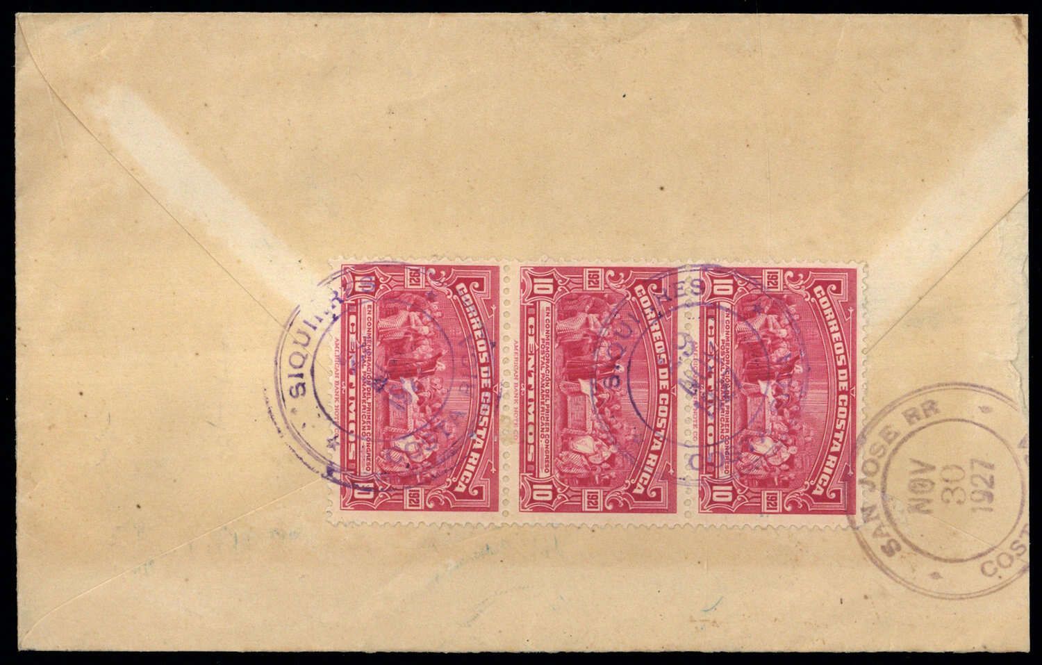 1926, 10 C Kolubus/Isabella karmin (3), rs. auf rechts verkürztem R-Brief, K2 "SIQUIRRES "29 NOV 1927", Beförderungs- Altersspuren, via San Jose, nach Turrialba