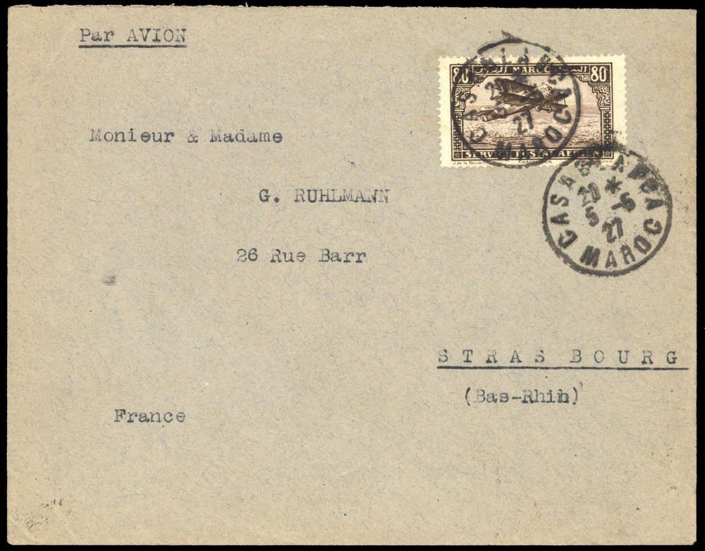 1926, 80 C braunlila, EF, Luftpostbrief, K1 "CASABLANCA 5-5 27", nach Strasbourg, Alters-Beförderungsspuren