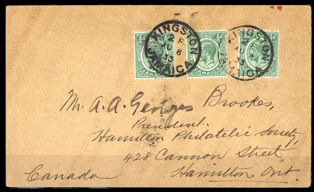 1927, 1/2 P Georg V.(3), K1 "KINGSTON JAMAICA AU 8 33", MeF auf Brief, Beförderungsspuren, nach Canada
