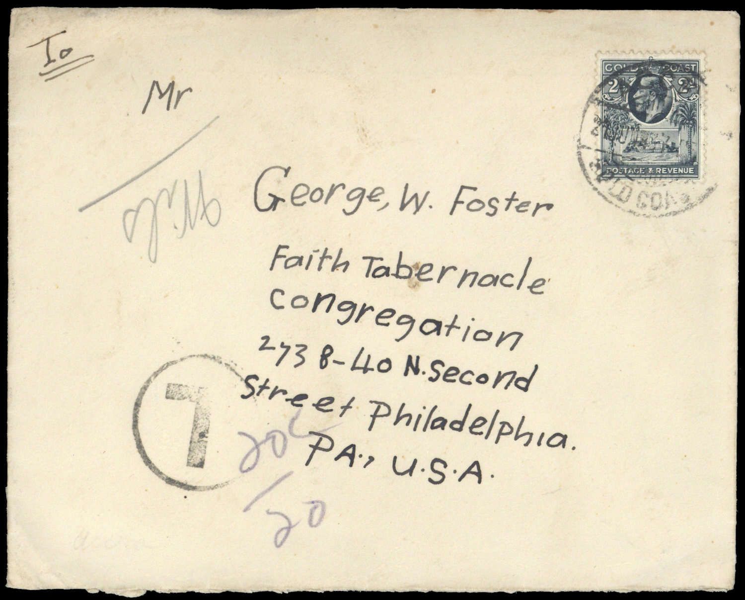 1928, 2 P schiefer, DB "ACCRA 21 JUN 37", Brief Beförderungs- Altersspuren mit Nachporto K1 "T", nach Philadelphia