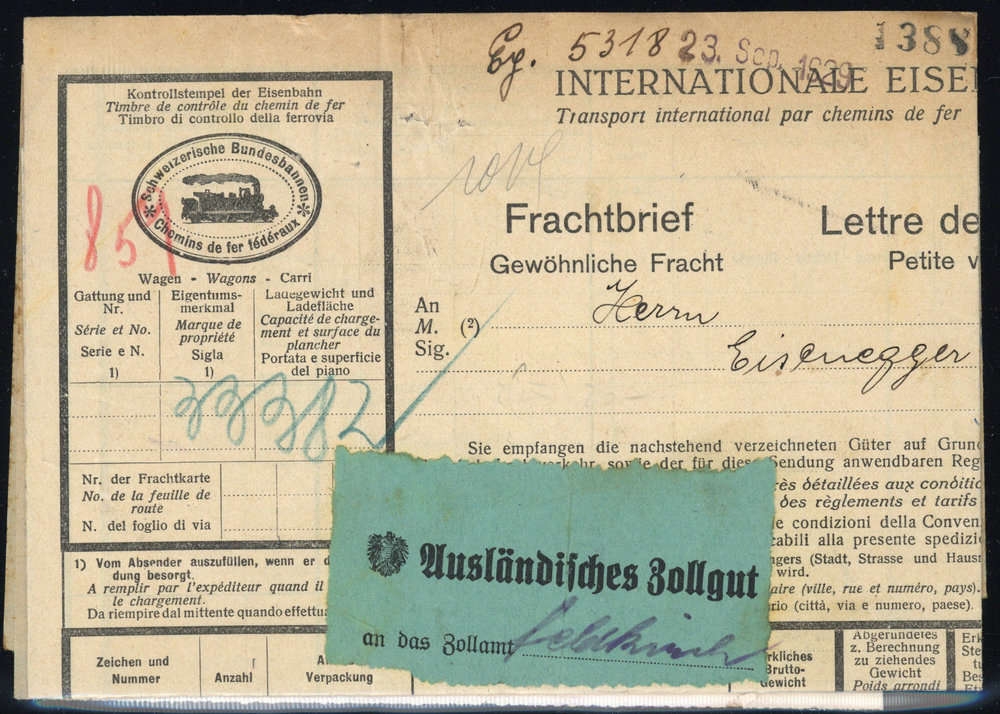 1929, vorgedruckter FRACHTBRIEF (Internationale Eisenbahnbeförderung - mehrseitig im größeren Format) mit diversen hds. Vermerken und Stempel u.a. Ovalstpl. "BAHNBETRIEBSAMT FELDKIRCH 22.IX.929-7 Ö.B.B. 3203", ferner passende Zollquittung, leichte Alterungs- und Beförderungsspuren.