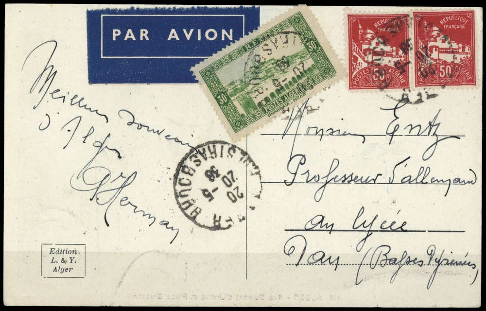1930/36, 50 C rot (2), mit 30 C Ghardaia-Mzab, Mängel, K1 "ALGIER 20-5 38", sw AK (Rue Dumont d'Urville), per Luftpost, Falzreste, nach Frankreich