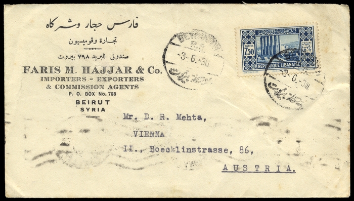1930, 7,50 Pia. (unregelmäßige Zähnung) auf Brief aus "BEYROUTH 3.6.30" nach Wien, Beförderungs-und Alterungsspuren