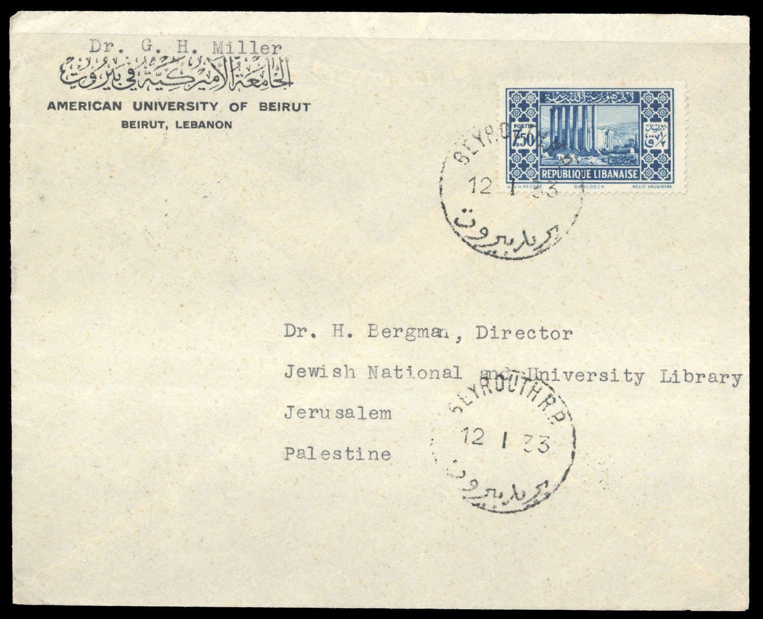 1930, 7.50 Pia Jupitertempel, K1 "BEYROUTH 12 I 33" auf Umschlag der American University, Beförderungsspuren, rs. Ak-K1 "JERUSALEM 13 JA 33"
