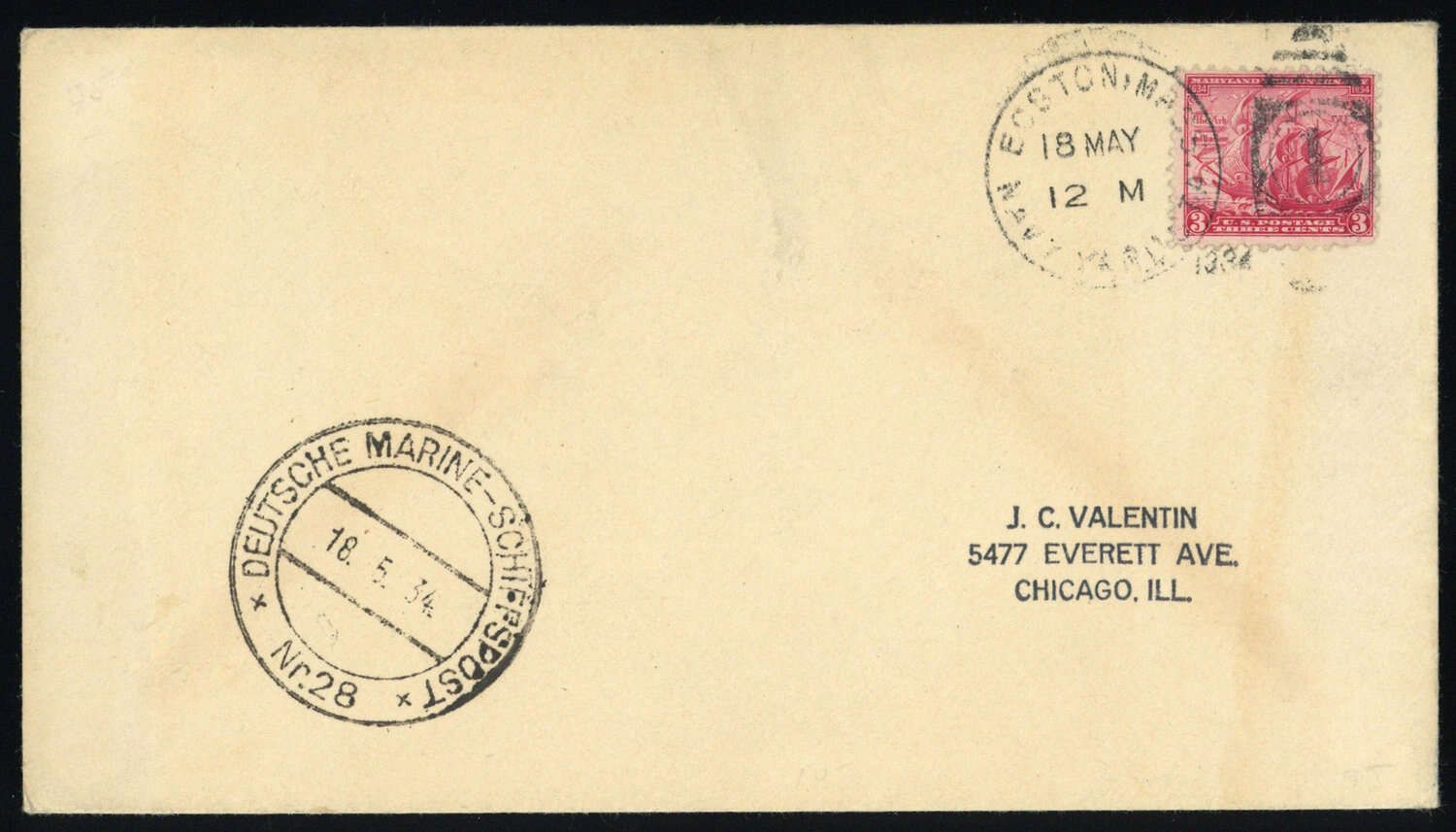 1934, "DEUTSCHE MARINE-SCHIFFSPOST Nr.28 18.5.34", Neben-K2 auf Brief mit US 3 C Segelschiff (eckrund), Duplex "BOSTON 18 MAY 1934", Beförderungs- Altersspuren, nach Chicago