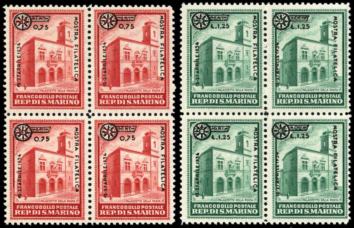 1934, 4 Werte Postgebäude mit Überdruck im tadellos postfrischen 4-er Block- Satz (ME 720.-)
