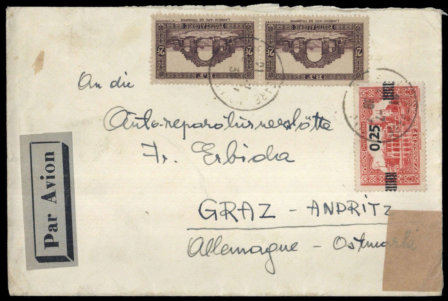 1936/38, 0.25 auf 50 C scharlach mit 2 Fr braunlila (2), K1 ".. GARE 21.7.39", per Luftpost, Beförderungs- Altersspuren, Ak-DB "GRAZ 27 VII 39"