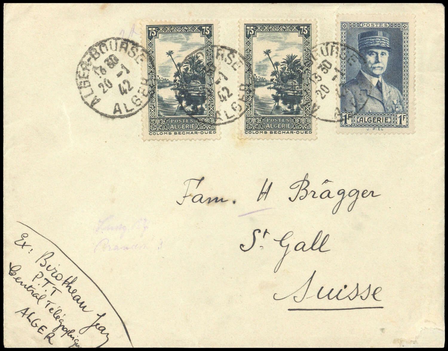1936/41, 75 C grauschwarz (2) mit 1 Fr Petain, K1 "ALGER-BOURSE 20-1 42", Brief Beförderungs- Altersspuren, nach St. Gallen
