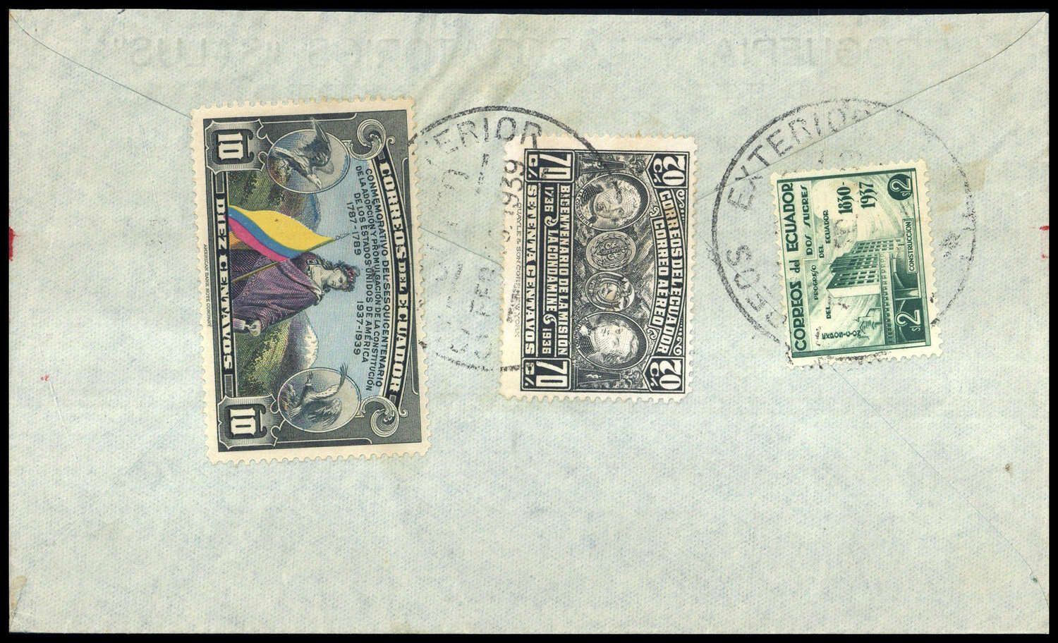 1936/38, 10 C Verfassung mit 70 C Südamerikaexpedition, 2 C grün Zusatz, SST "QUITO FEB 10 1939", rs. auf Luftpostbrief, Beförderungs- Altersspuren, nach Nürnberg