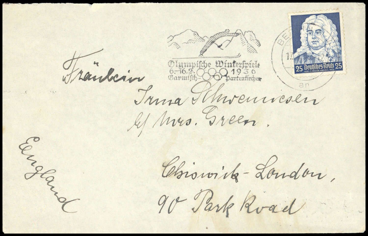 1936, 25 Pfg. Händel (Zahnverkürzungen) auf Brief mit Maschinenwerbestpl. "BERLIN 17.1.36 - Olympische Winterspiele 6.-16.2.1936 - Garmisch-Partenkirchen" nach London / England, leichte Alterungsspuren.