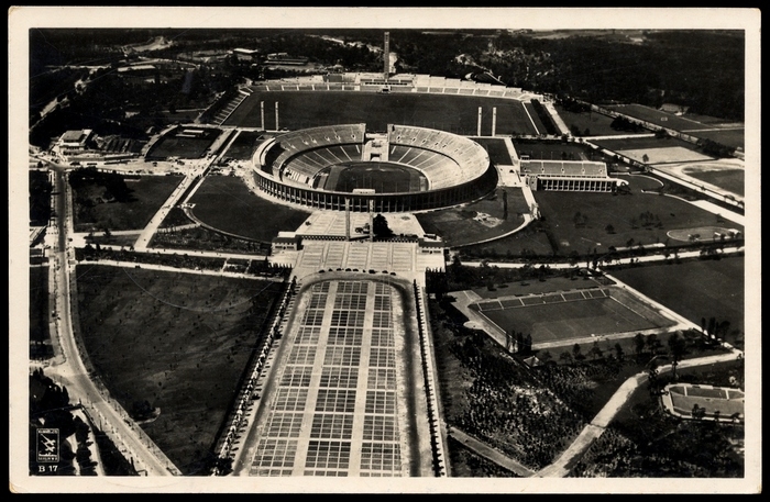 1936, s/w-Karte "Gesamtansicht Reichsportfeld", ungebraucht, Marke Auflebespuren, RSV 10
