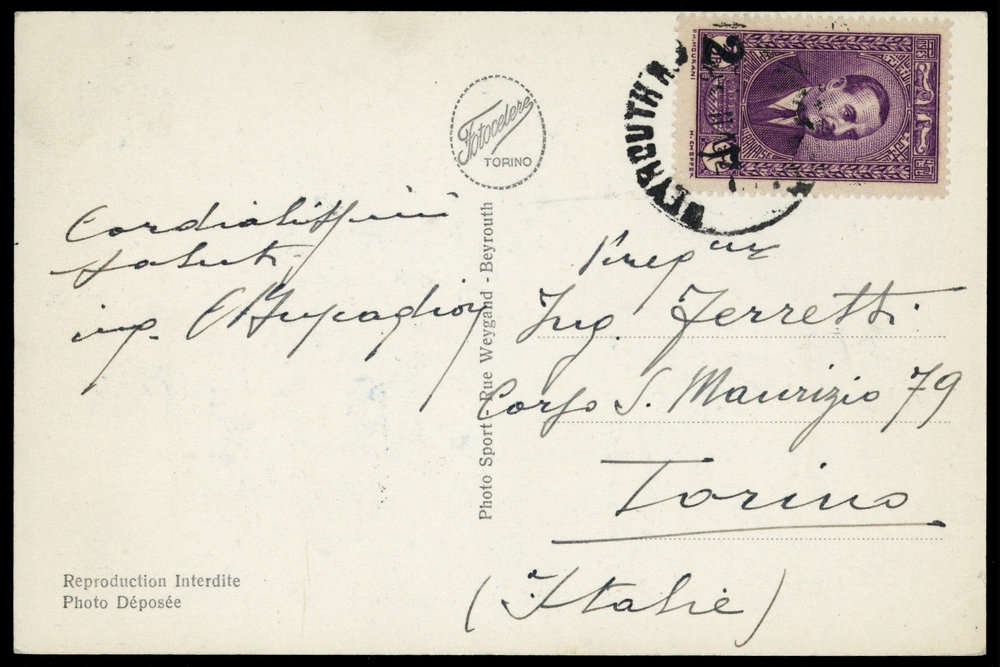1938, 2/3 Pia violett, K1 "BEYROUTH", EF auf Fotokarte (Résidence du Haut-Commisaire), nach Turin/I