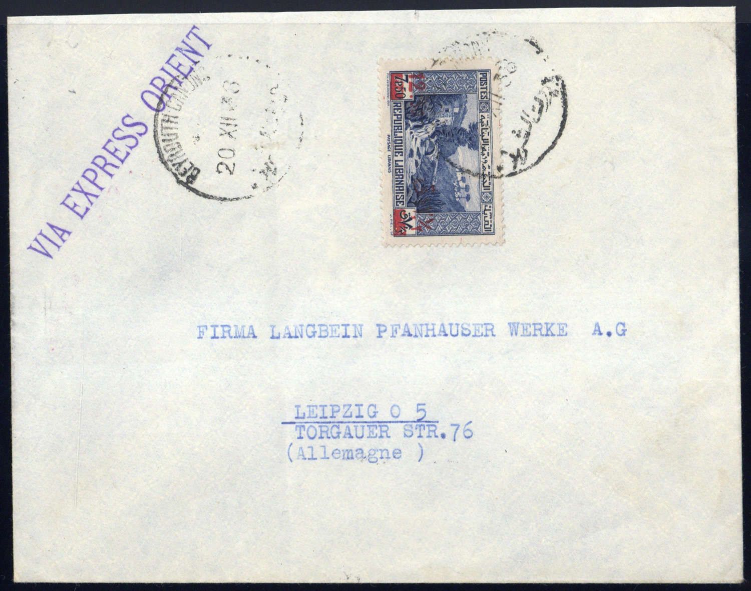 1938, 12.50 Pia rot auf 7.50 Pia blau, K1 "BEYROUTH 20 XII 38", Brief links senkrechte Faltung, Neben-L1 "VIA EXPREDSS ORIENT", Beförderungsspuren, nach Leipzig