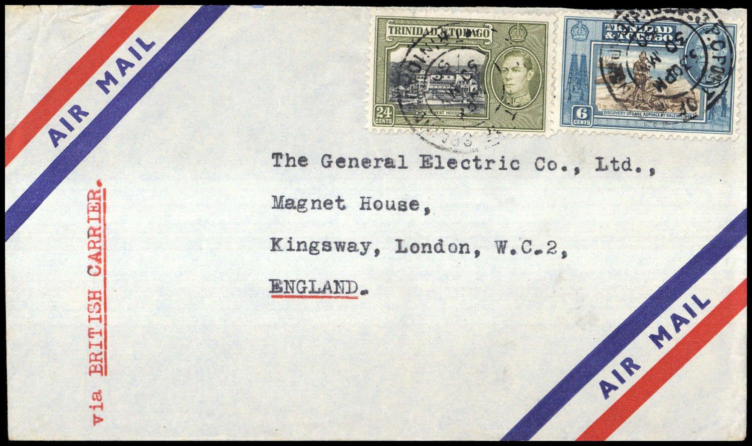 1938, 6 und 24 C Landschaften/Bauwerke, K2 "PORT OF SPAIN 30 MY 50", Luftpostbrief, Beförderungsspuren, nach London