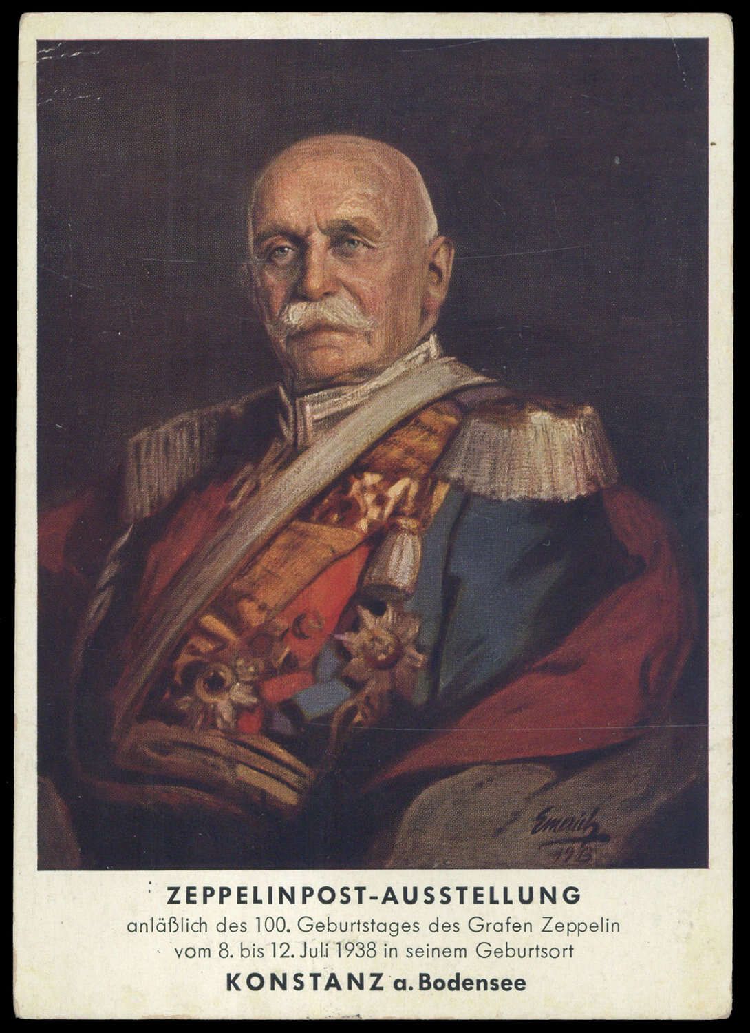 1938, farbige Sonderkarte "ZEPPELINPOST-Ausstellung - mehrfarbiges Porträt" mit Nr. 512 frankiert mit entsprechendem SST "KONSTANZ 8.7.1938", leichte Rand- und Alterungsspuren.