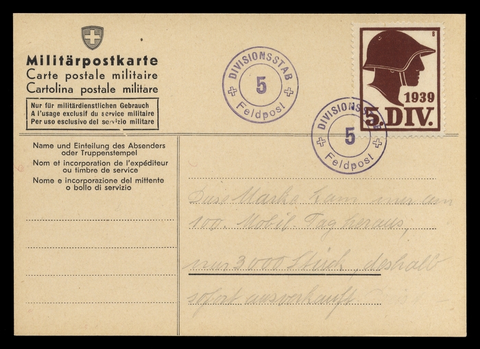 1939, "DIVISIONSSTAB 5 Feldpost", K2 auf Marke "5. DIV. 1939" auf Militärpostkarte ohne Adresse, Alterungsspuren