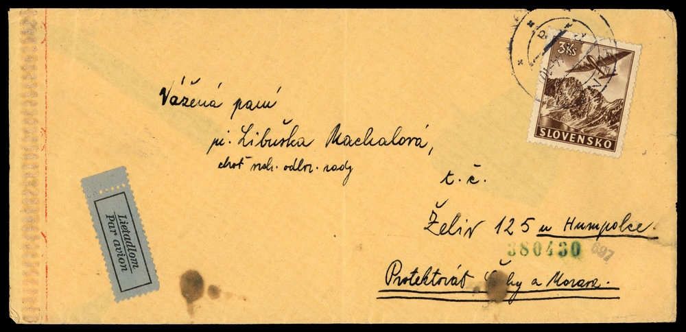 1939, 3 Ks Flug, unregelmässige Zähne, K2 "TRENCIN 3 VII 44", Luftpostbrief mit OKW-Zensur, mittig senkr. Faltung, Beförderungs- Altersspuren, nach Zeliv