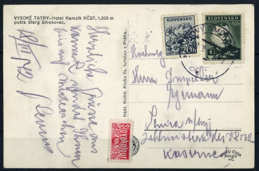 1939/40, 50 H Tiso und 20 H Edelweiß, kleine Mängel, K2 "NOVY SMOKOVEC 28...40", etwas bügige Foto-Glanz-AK (Vysoké Tatry, Hotel Kcst.), Beförderungsspuren