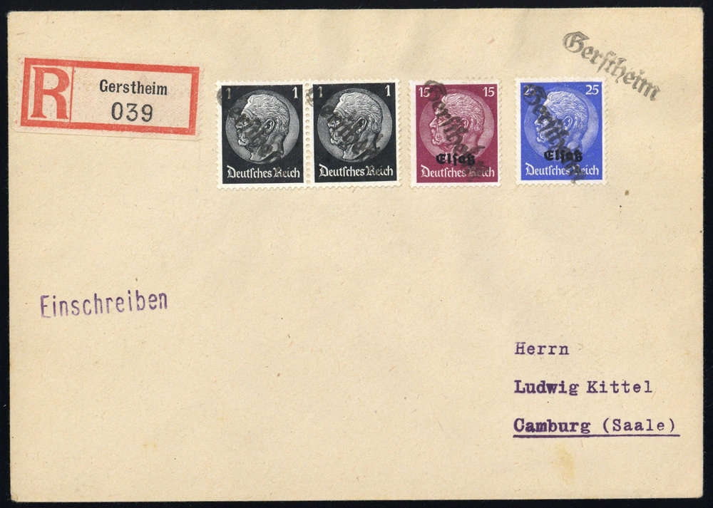 1940, 1 Pfg. Hindenburg-Aufdruck, waagerechtes Paar mit Nr. 8 + 10 zusammen auf R-Brief mit schwarzem Einzeiler "Gerstheim" entwertet nach Camburg (Saale), rs. Ankunftsstpl. "15.11.40", Kuvert leichte Spuren.