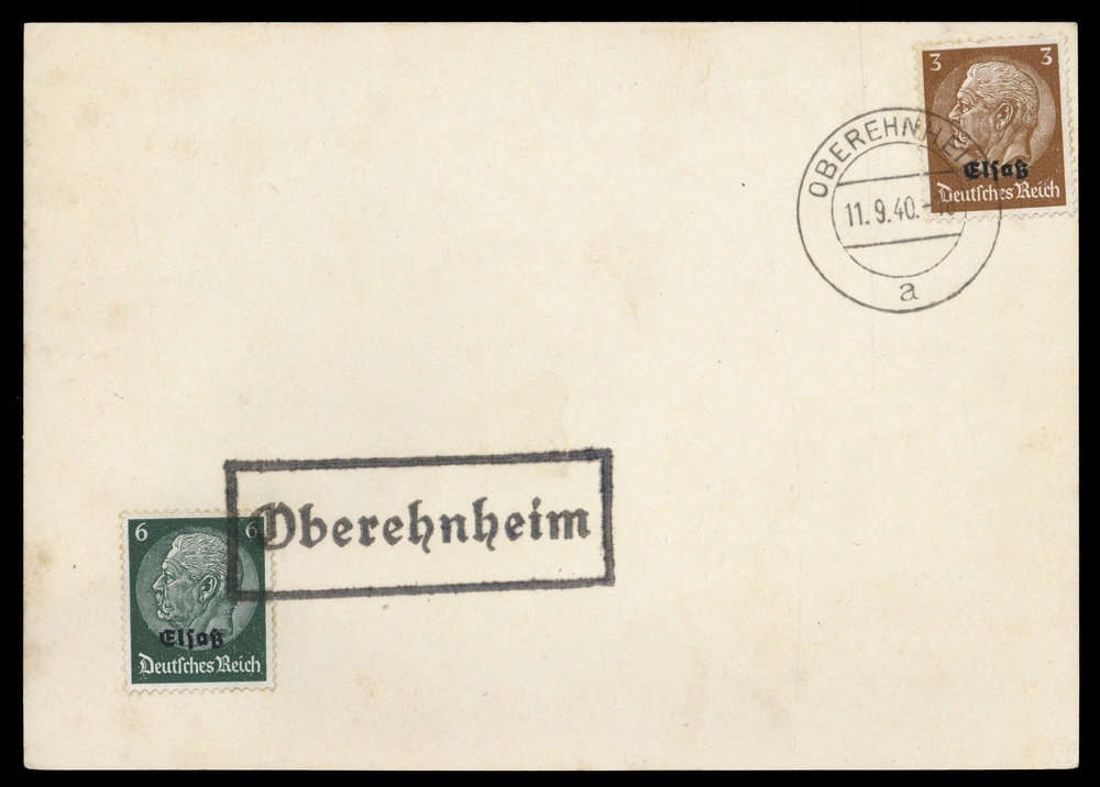 1940, 3 + 6 Pfg. Hindenburg zusammen auf Blankokarte mit Stpl. "OBEREHNHEIM 11.9.40" bzw. Ra1 "Oberehnheim", leichte Alterungsspuren.
