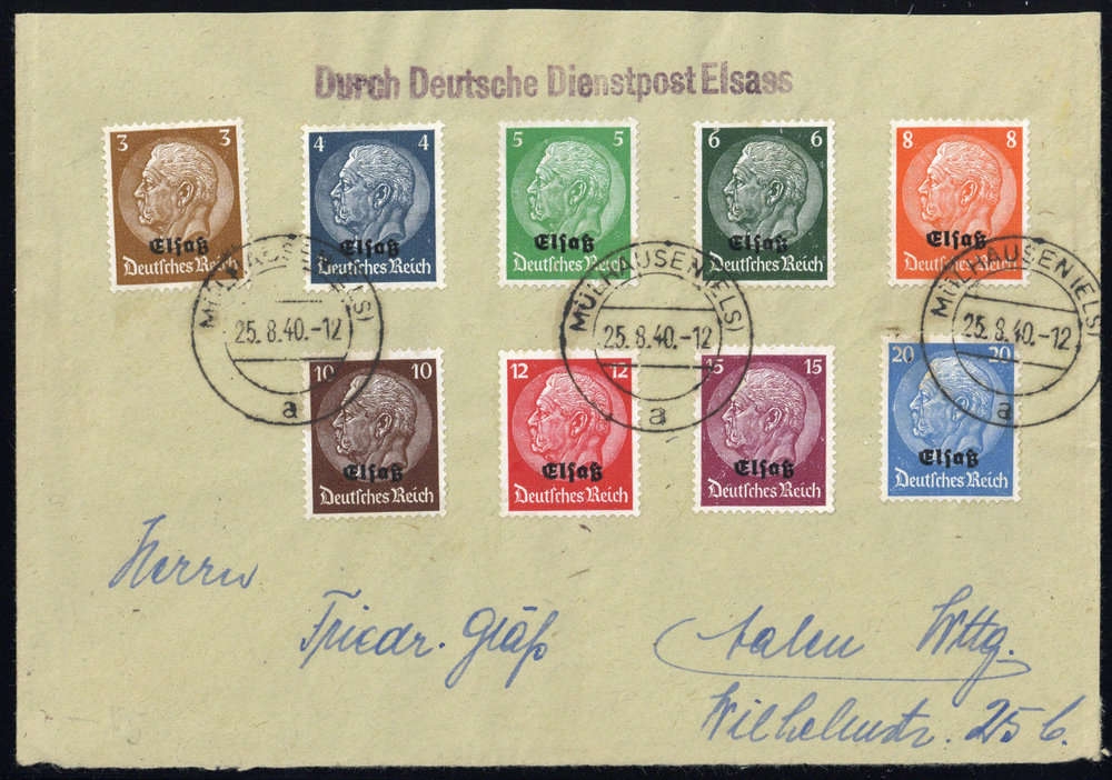 1940, 3-20 Pfg. Hindenburg-Überdruck, 9 Werte zusammen auf Brief mit Stpl. "MÜHLHAUSEN 25.8.40" nach Aalen, violetter Einzeiler "Durch Deutsche Dienstpost Elsass", Marken und Kuvert leichte Spuren.
