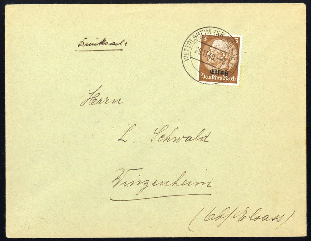 1940, 3 Pfg. Hindenburg phil. auf Drucksache von WETTOLSHEIM 28.11.40 nach Winzenheim / Elsass, Marke leichte Unebenheiten.