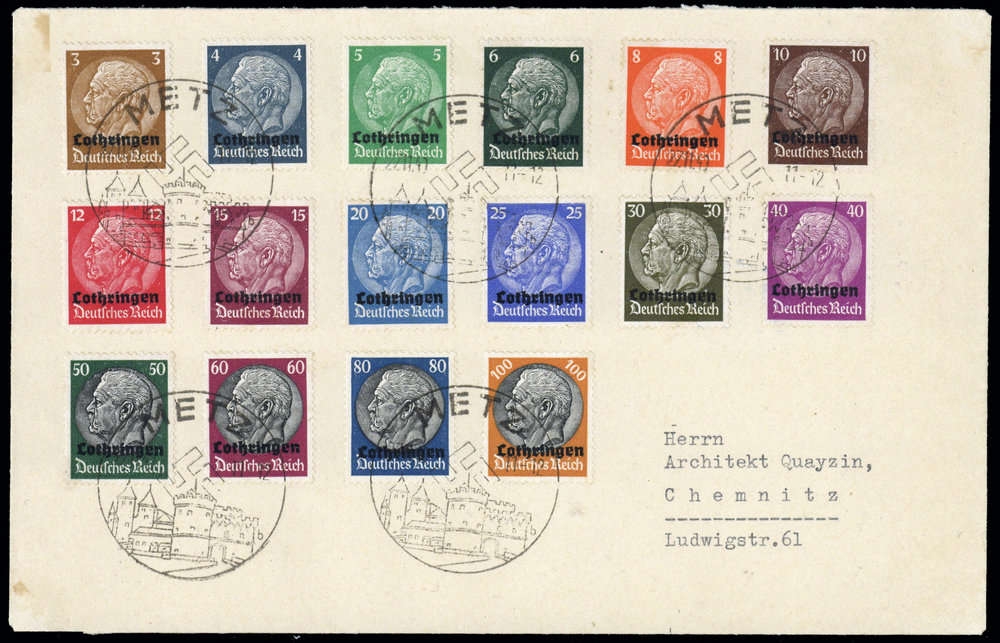 1940, 3-100 Pfg. Hindenburg-Aufdruck, 16 Werte komplett auf Satz-Brief mit fünfmal SST "METZ 27.11.1940", adressiert nach Chemnitz, Marken und Kuvert leichte Spuren.