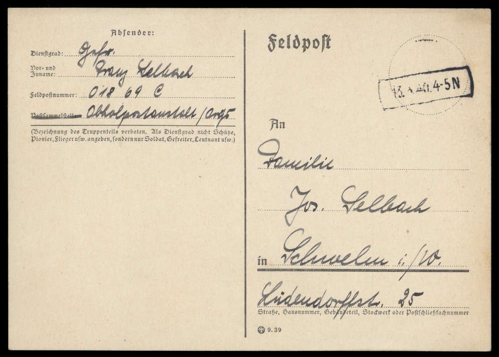 1940, Feldpostkarte mit Ra1 "13.3.40 4-5N.", adressiert nach Schwelm, viel Bedarfstext, leichte Alterungsspuren.