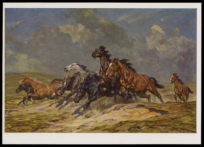 1940, Farbkarte "Alfred Roloff Flüchtende Pferde", ungebraucht, Hoffmann