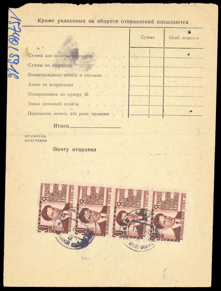 1940, 4 x 30 K W.Majaowski auf Postzustellquittung vom 13.08.1940, Randspuren