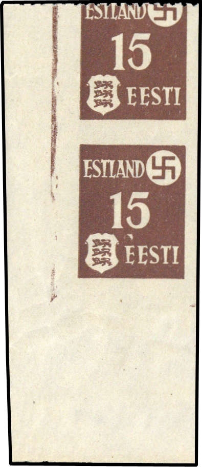 1941, 15 K. Landespost im senkrechten Paar postfrisch mit der Besonderheit "untere Marke ungezähnt und obere Marke nur oben gezähnt" mit üblicher Gummierung. In dieser Form nicht im Michel Spezial 2019 notiert!