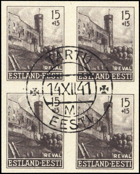 1941, 15+15 Kopeken Turm "Der lange Hermann" ungezähnt als fast zentrisch gestempelter 4-er Block mit der außergewöhnlichen Besonderheit "Unterdruck auf der Rückseite" (ME 800.-)