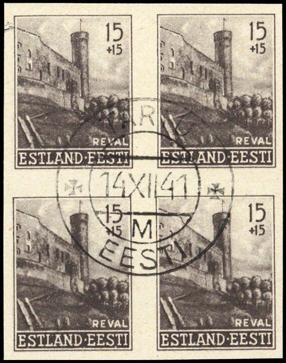 1941, 15+15 Kopeken Turm "Der lange Hermann" ungezähnt als fast zentrisch gestempelter 4-er Block mit der außergewöhnlichen Besonderheit "Unterdruck auf der Rückseite" (ME 800.-)