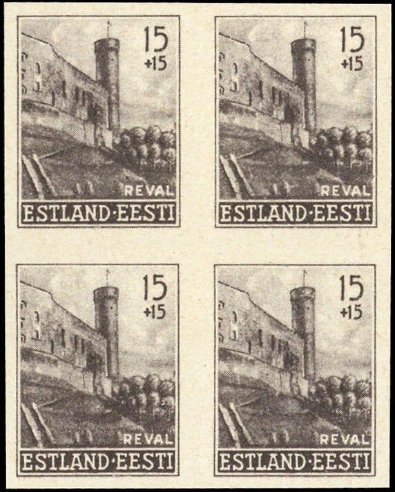 1941, 15+15 Kopeken Turm "Der lange Hermann" ungezähnt auf ungummiertem Papier hergestellt als 4-er Block mit der außergewöhnlichen Besonderheit "Unterdruck auf der Rückseite"