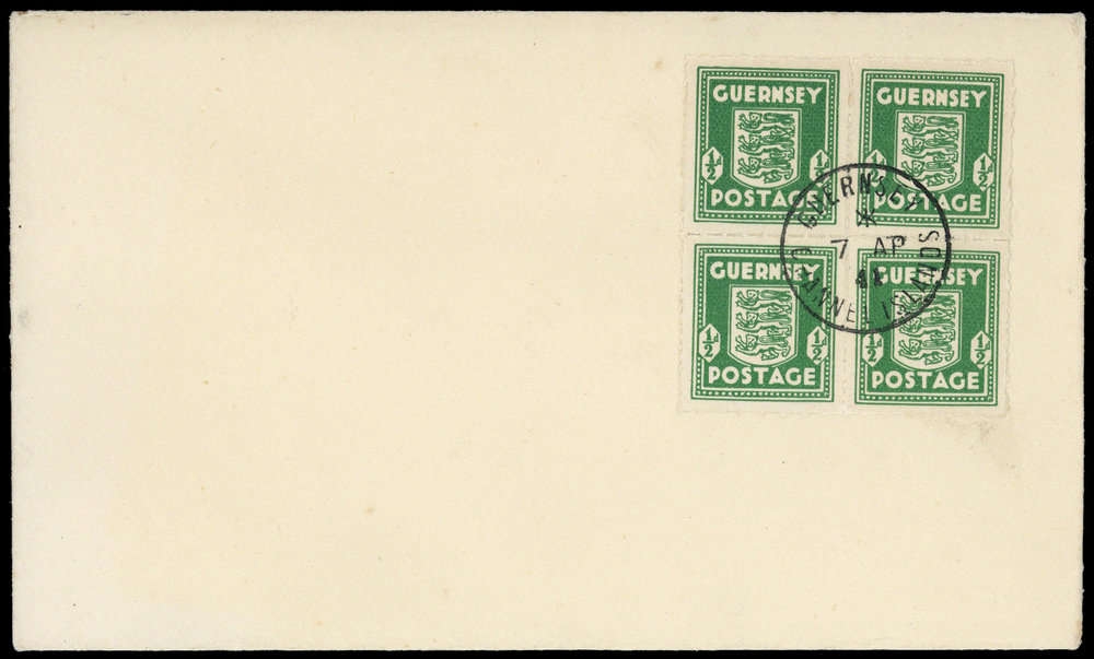 1941, 1/2 P. Wappen, Viererblock auf Blanko-FDC mit Stpl. "GUERNSEY 7.4.1941".